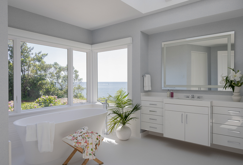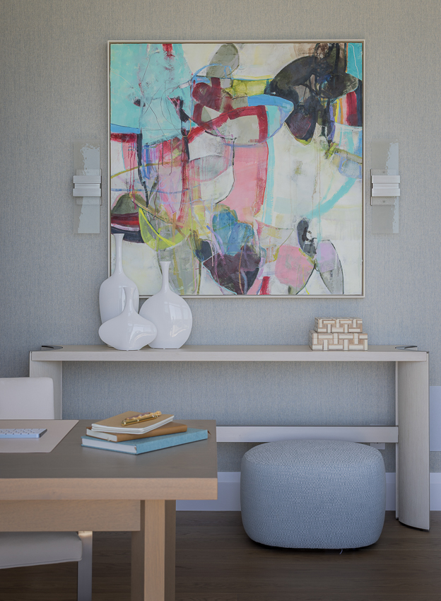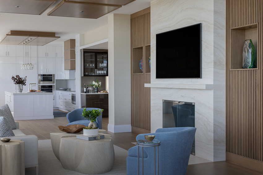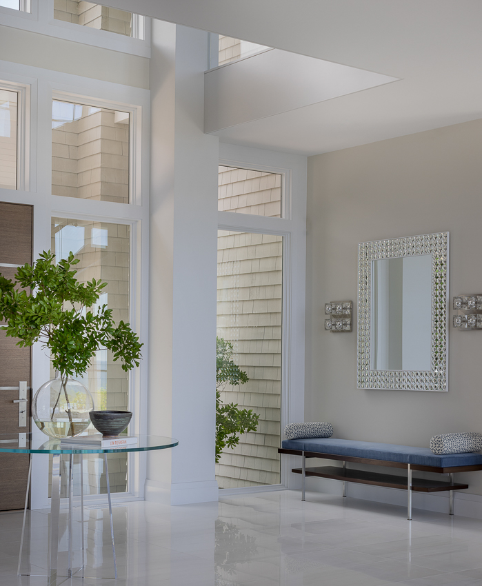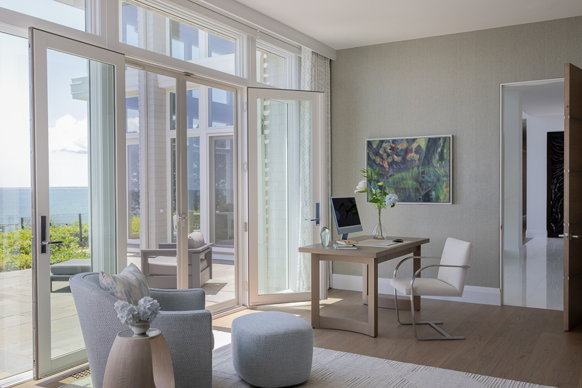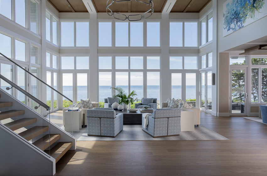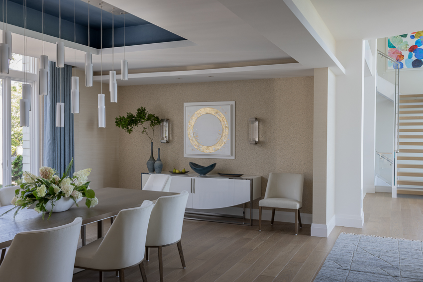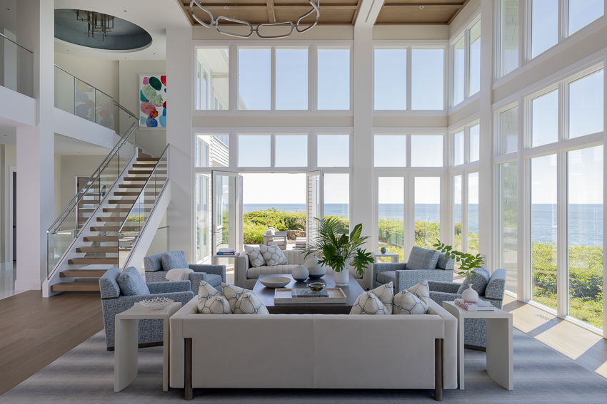 This oceanfront home’s views are priceless; however, after almost thirty years, the interiors were dated and drab. A total renovation using updated designs and materials includes a new kitchen and bathrooms as well as beautiful millwork feature walls and ceiling treatments and fabulous stone slabs. A new, open tread staircase replaces the original curved design. The contemporary furniture, area rugs, wall coverings and accessories create a sophisticated and comfortable seaside retreat.