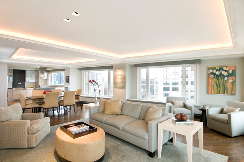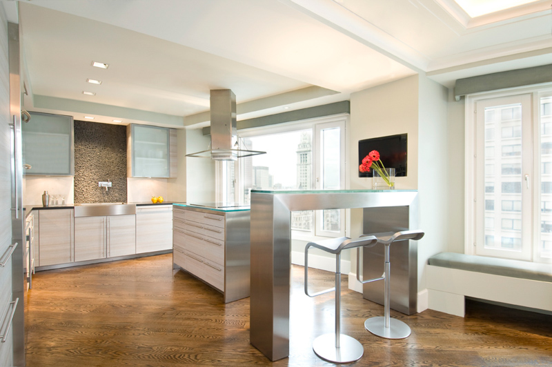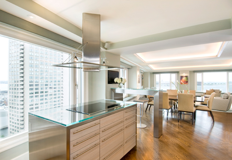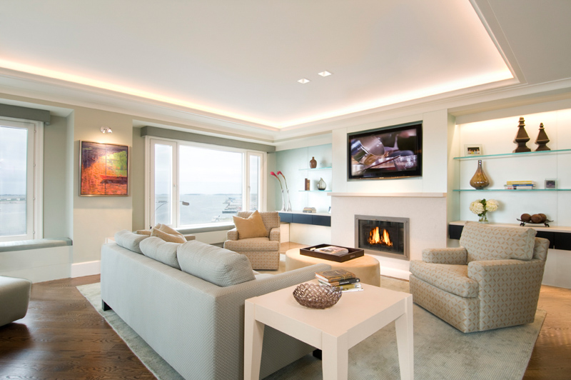 The total renovation of this 1980’s era home, with its outdated materials and cramped spaces, provided a clean palette to bring it forward to the current times. By opening the wall between the living area and the future kitchen, this created an open concept expanse which allowed the homeowners to take advantage of the fabulous water view. With cleaned lined, comfortable and transitional furnishings, the home is welcoming but also city chic. The fireplace was enhanced with a beautiful feature wall consisting of cantilevered glass shelving, sandblasted mirror, cabinetry topped with stone, and extensive LED accent lighting. Throughout the whole residence, soffits that were designed with intent and with lighting to enhance the space.