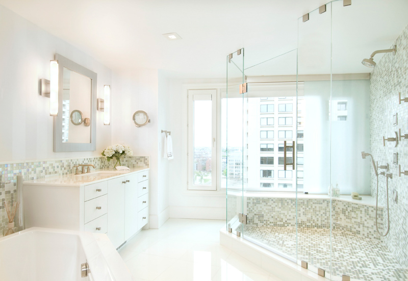 Pre-construction, the master bathroom was a real throwback in time with its outdated tile materials, small shower, overly large tub and poor lighting. The bathroom was totally reconfigured to accommodate the homeowners’ wishes for a large shower and smaller tub, using materials that are crisp and clean and appropriate to an urban, waterfront space.