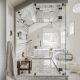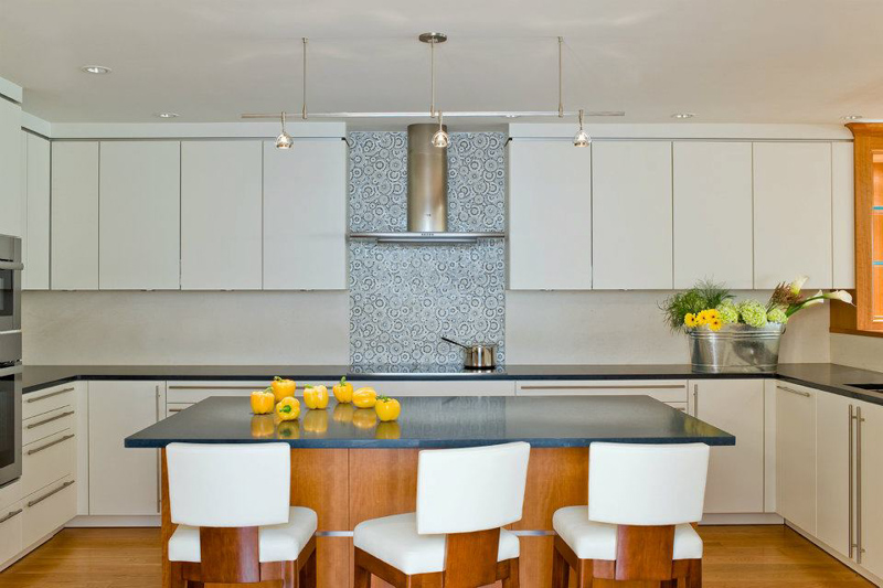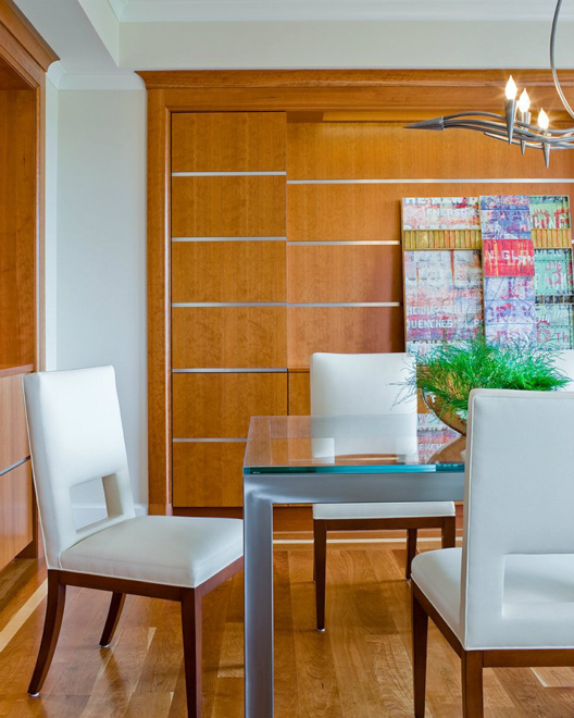 Each and every space in the home was demolished to make way for updated designs. Beautiful cherry millwork was incorporated in many areas of the home, and a new, fully integrated lighting plan was put into place. A new contemporary kitchen, fully new bathrooms with gorgeous tile designs and plumbing selections brought the spaces to present day chic.