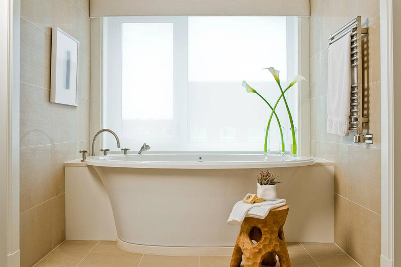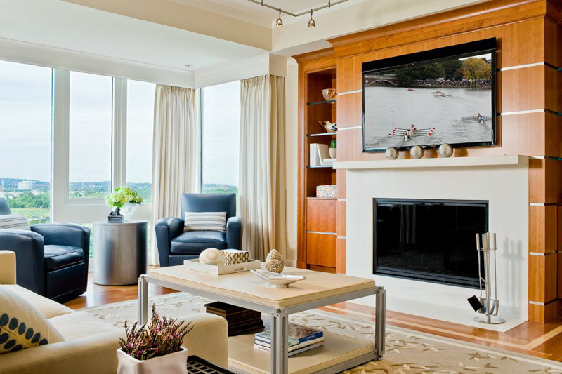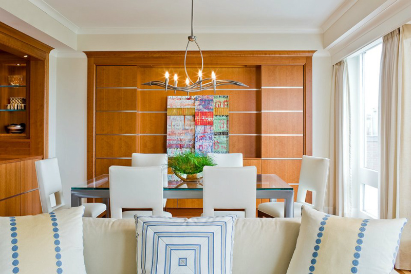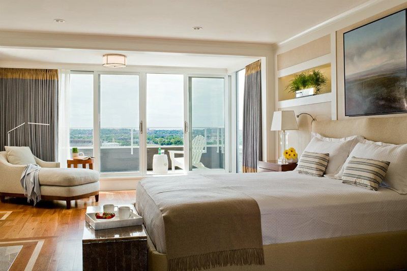 Motorized shades and drapes were installed behind the window soffits, allowing for the optimization of the wonderful view but also serving to protect the rooms from harsh sunlight and glare when needed.