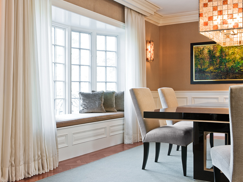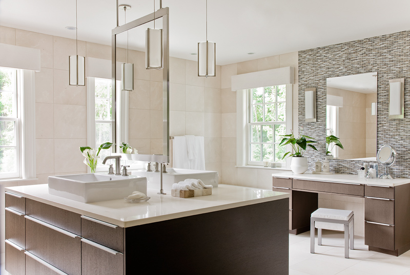 In this newly built suburban home, the original layout of the master bathroom was a confined space that was divided into four separate rooms. To create an open concept floor plan and a relaxing, spa-like retreat, the walls dividing the warren of rooms were removed. The new design transformed the bathroom into a large, functional space that is flooded with natural daylight. An unusual double vanity configuration, placed in the center of the room, features a custom two sided stainless steel mirror anchored from the ceiling. Mosaic tile, a soaking tub and large shower, a makeup vanity and other storage solutions and amenities add to the beauty and function of the space.