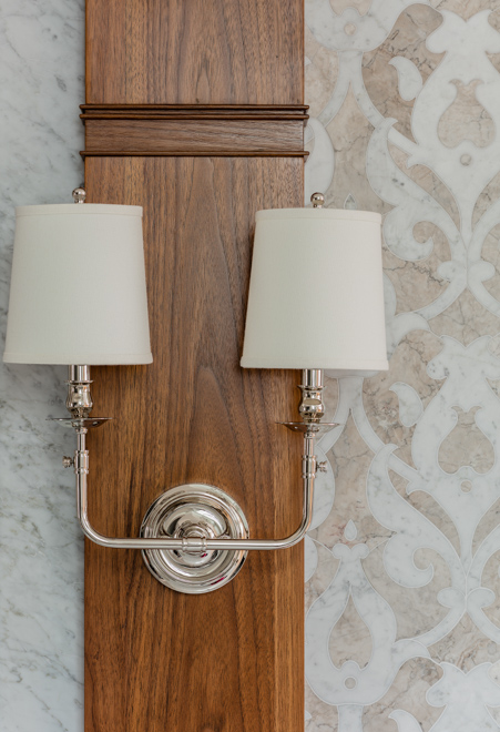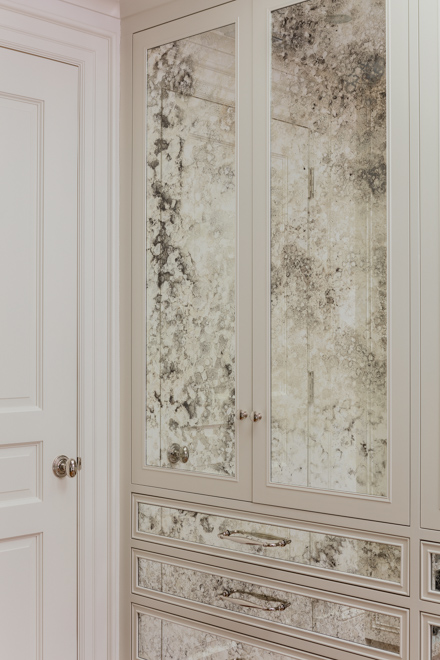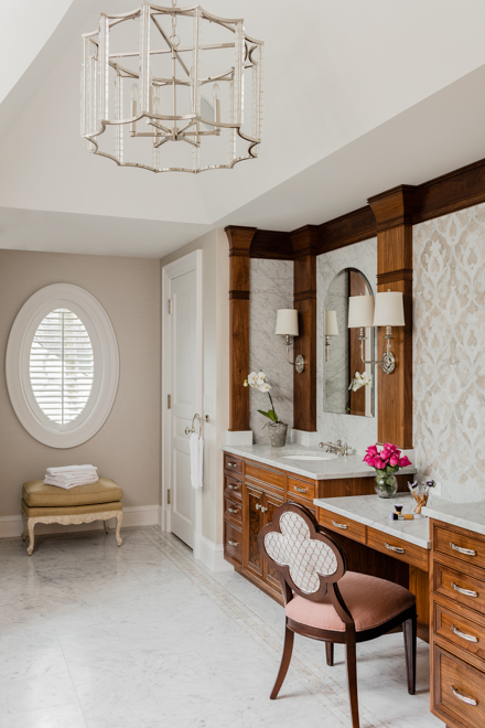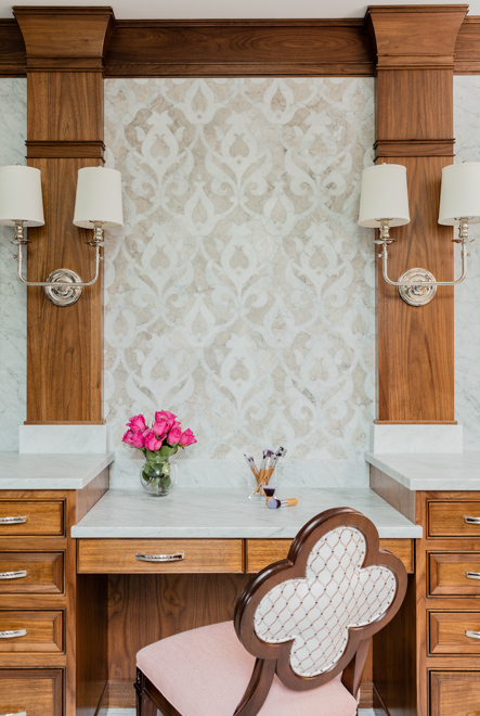 This sprawling master bathroom was fully renovated as the existing layout and features did not meet the homeowners’ needs, and the design lacked the elegance that they desired. The clients wanted to create a luxurious retreat. Every inch of the space received careful consideration and detail. The centerpiece of the space is the gorgeous mirrored bathtub with a custom mosaic surround which appears throughout the bathroom. Each material and plumbing fixture was diligently selected while the walnut vanities and other details in the space were custom fabricated.
