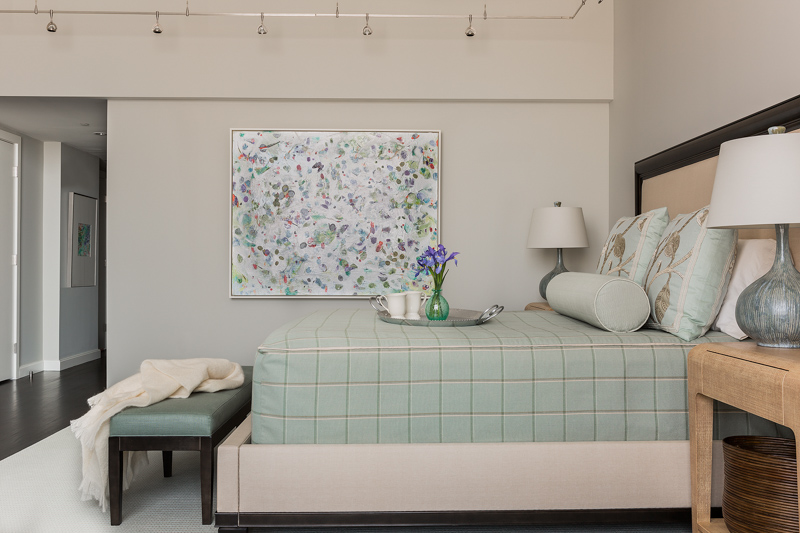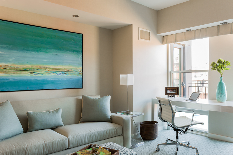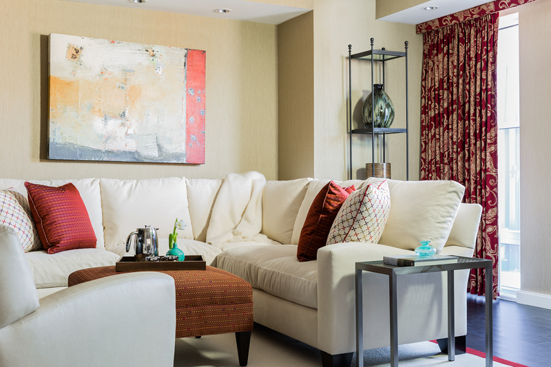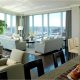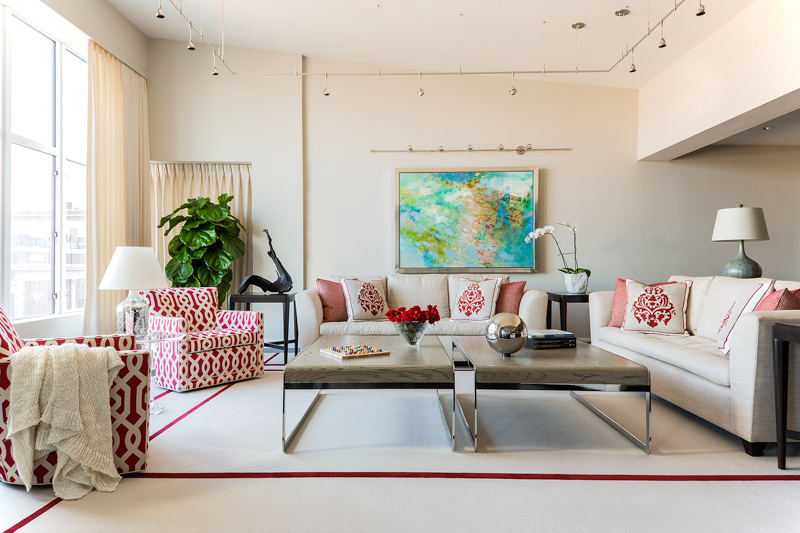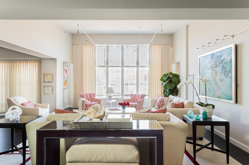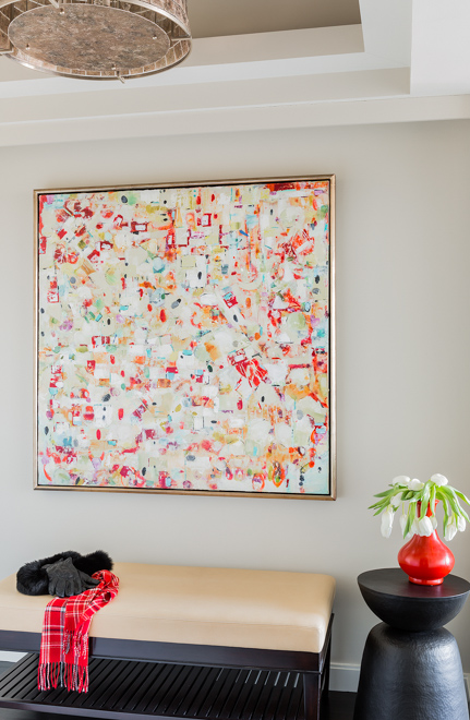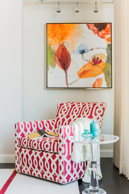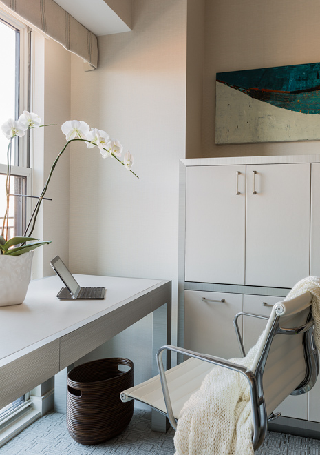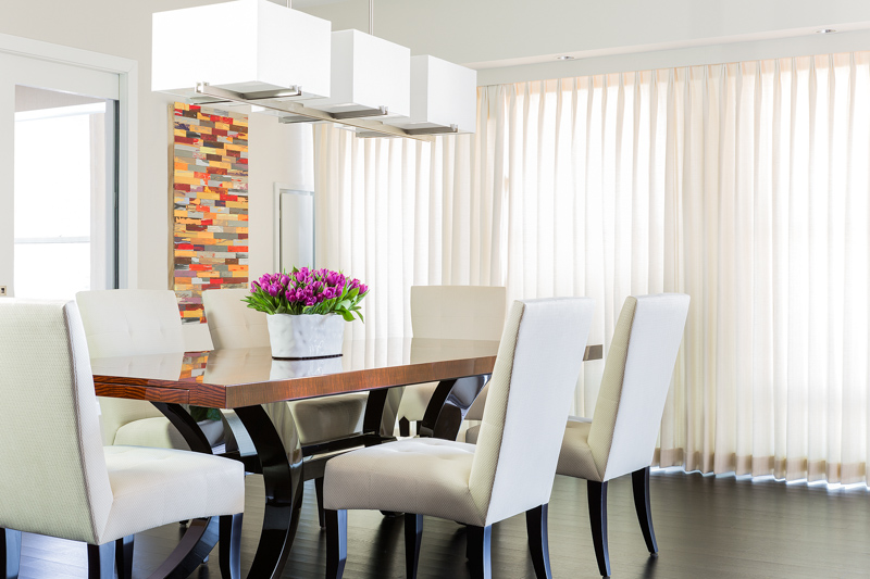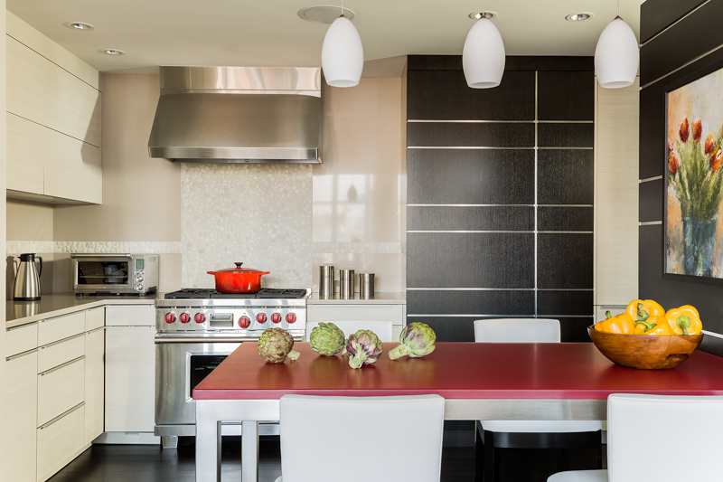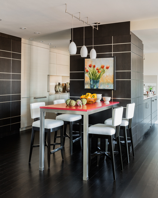 Prior to the total renovation of the whole home, the kitchen was chopped up into three separate areas: a smaller, outdated kitchen, an adjacent pantry space and a narrow laundry room. In order to create a kitchen that was both aesthetically pleasing and functional, the laundry room was relocated to another part of the condo and the pantry was integrated into the new kitchen design. With walls removed and the floor plan wide open, the kitchen cabinetry, appliances, coordinating millwork and other elements were designed and integrated, resulting in a seamless, contemporary and elegant design which flowed to the adjoining living room and dining room.