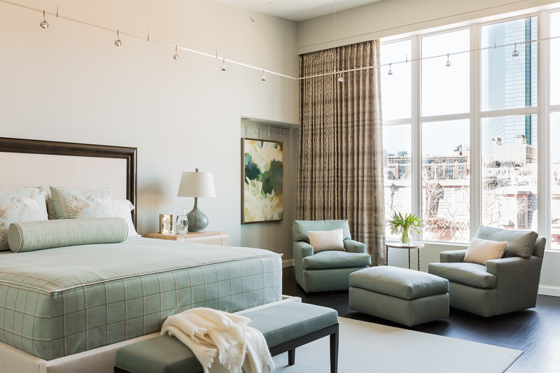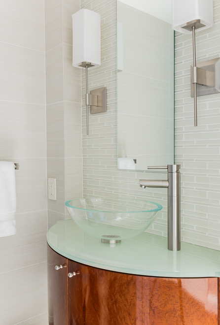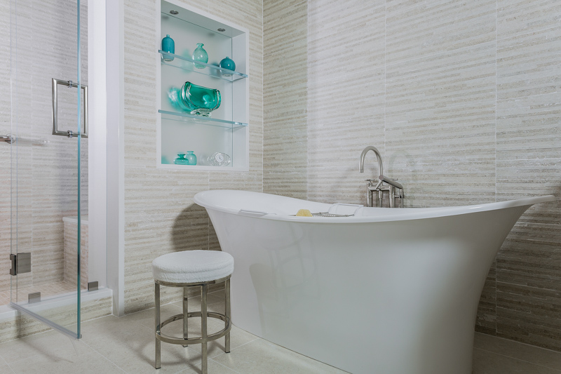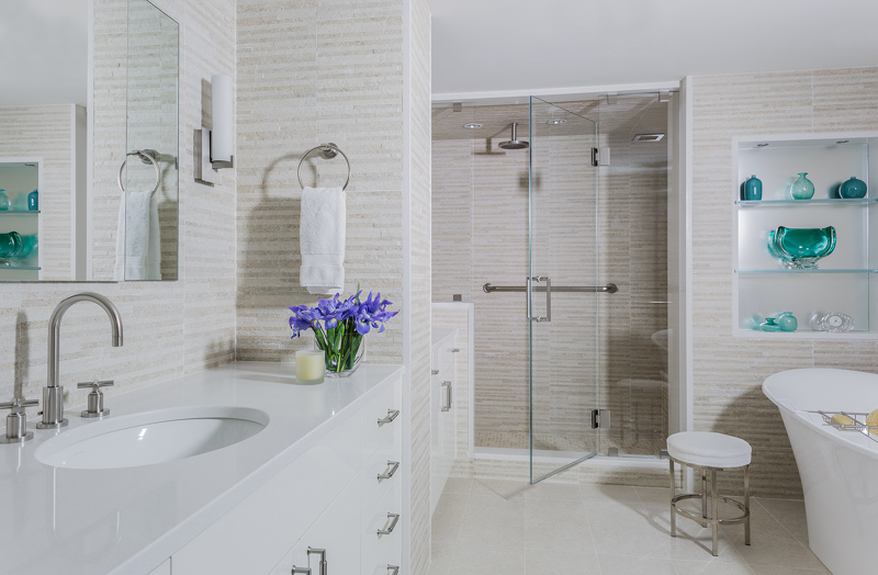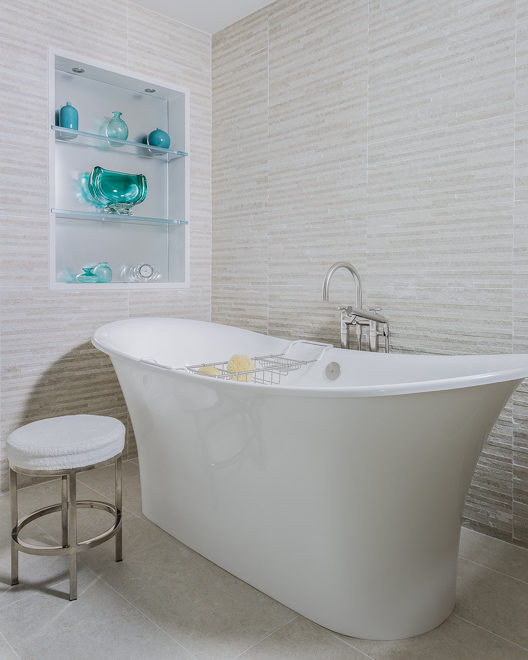 The goal of the master bathroom remodel was to create an open, airy, spa-like escape. to achieve this goal, the floor plan was reconfigured to deal with a number of negative issues including a vanity which lacked adequate counter space and storage as well as an outdated and overly large tub. First, separate “his” and “her’ vanities were created to give both users their own areas with plentiful counter space and storage via custom cabinetry and recessed medicine cabinets. Further, the wall between the toilet and tub was reduced to counter height to create a feeling of openness but still maintaining the separate spaces. A sculptural, free standing bathtub took center stage in the space, and a wonderful lighting plan was created to provide both mood and task lighting. Materials were selected to align with the goal of a spa-inspired space. The result: A beautiful spa-like master bathroom retreat loaded with amenities, function and comfort.