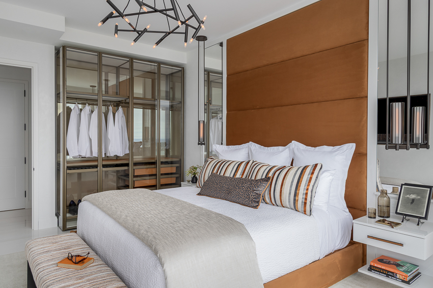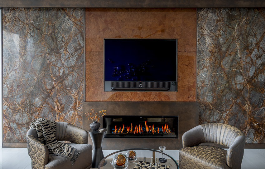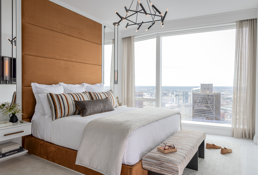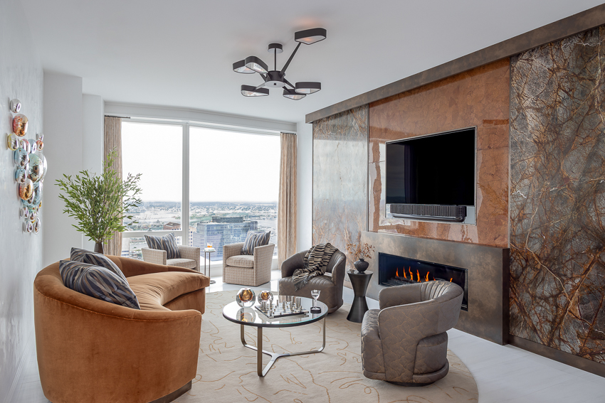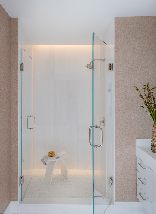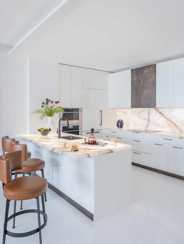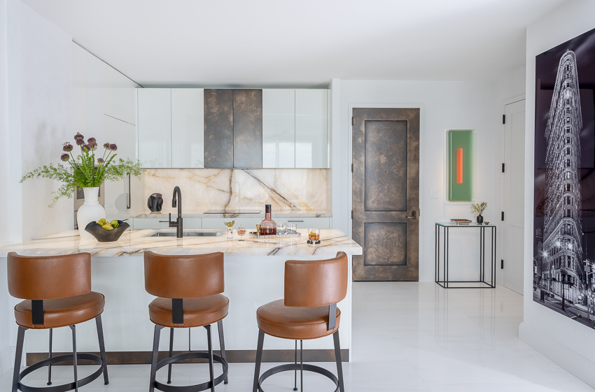 This “sky high” Boston condo with a gorgeous view of the city and harbor was just a plain white box that we, with FBN Construction, totally transformed into a sophisticated pied-a-terre! The living room’s feature wall includes a fireplace and is adorned with incredible materials – gorgeous stone slabs, parchment and custom painted bronze finishes. The kitchen’s countertops and backsplash are onyx slabs that are backlit for a dramatic effect. The furnishings are bold, stylish and comfortable. In the bedroom, the closet was removed to open up the space, and a glass enclosed storage piece takes its place. The feature wall in this bedroom is dramatic with its floor-to-ceiling headboard and mirrors. A very comprehensive lighting plan was put into place as well as the addition of beautiful artwork throughout.